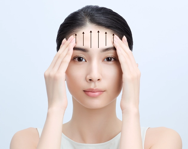 For the forehead, gently massage from bottom to up using the ball of the middle and ring fingers of both hands.